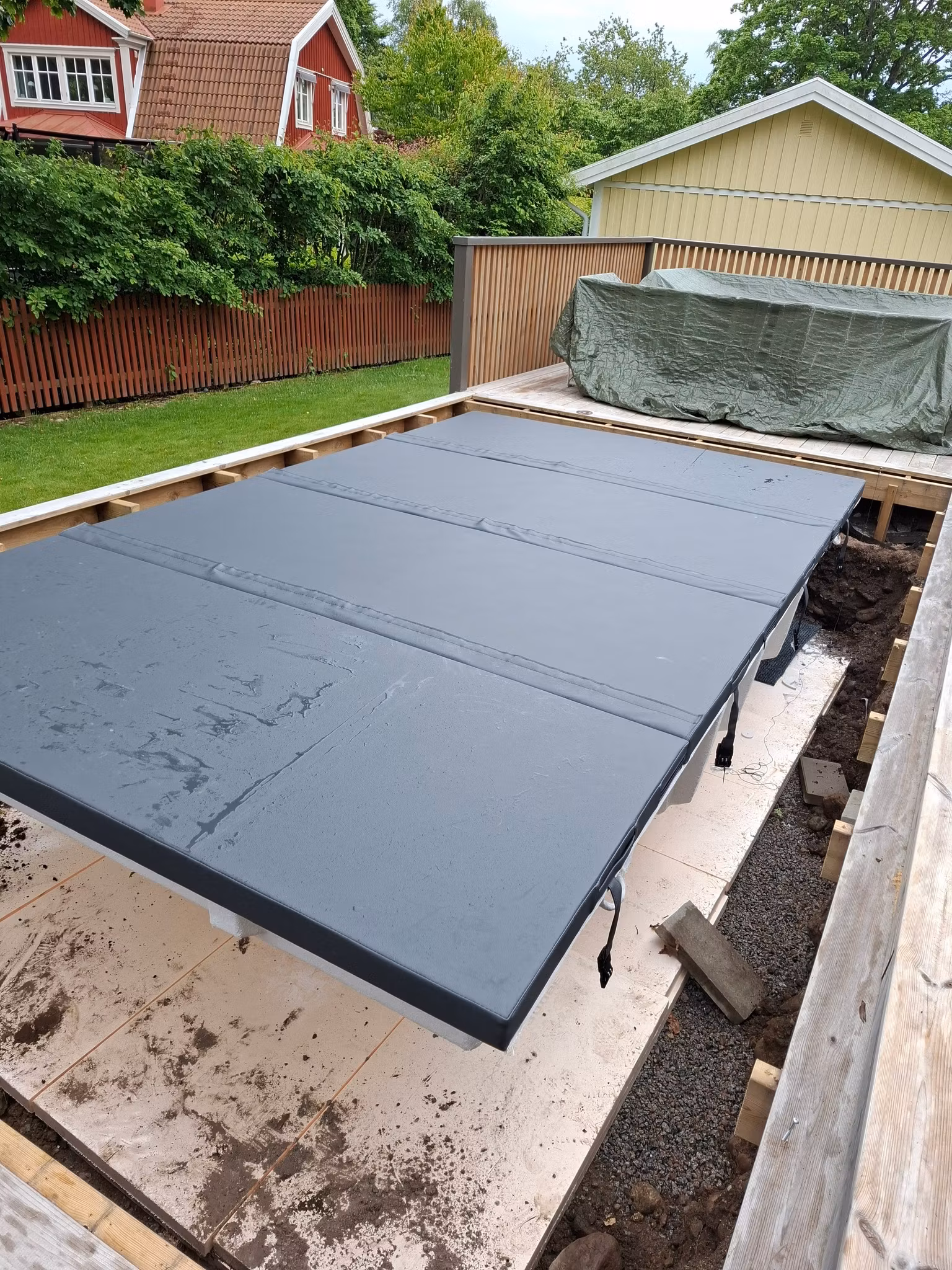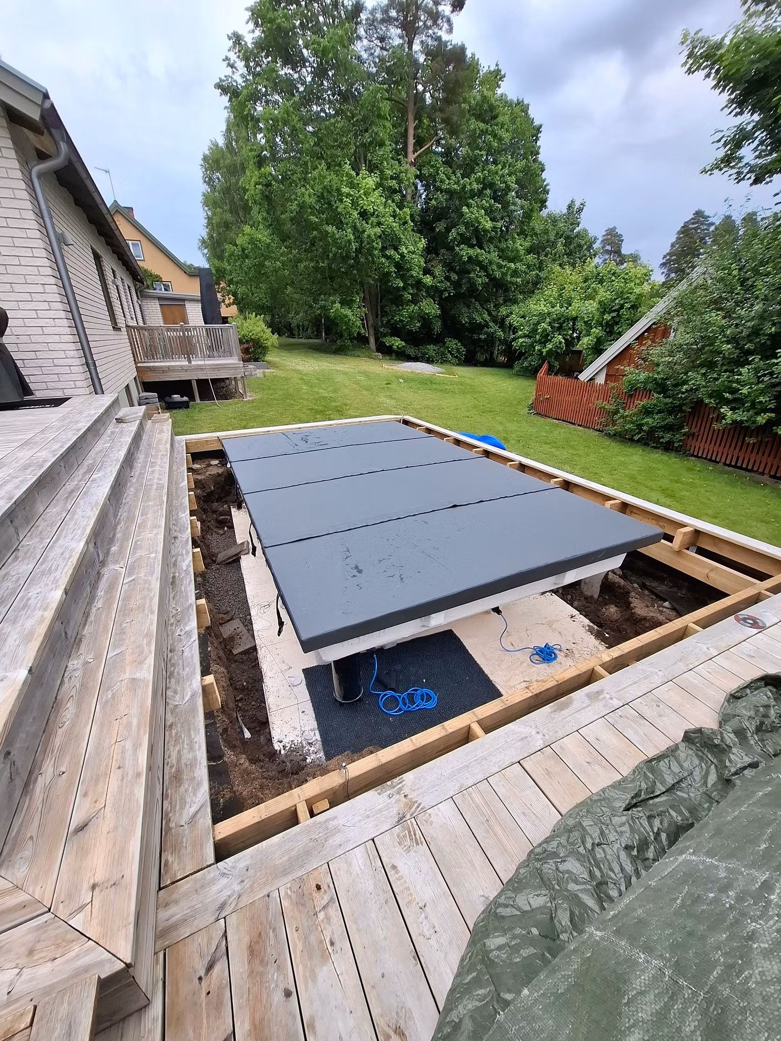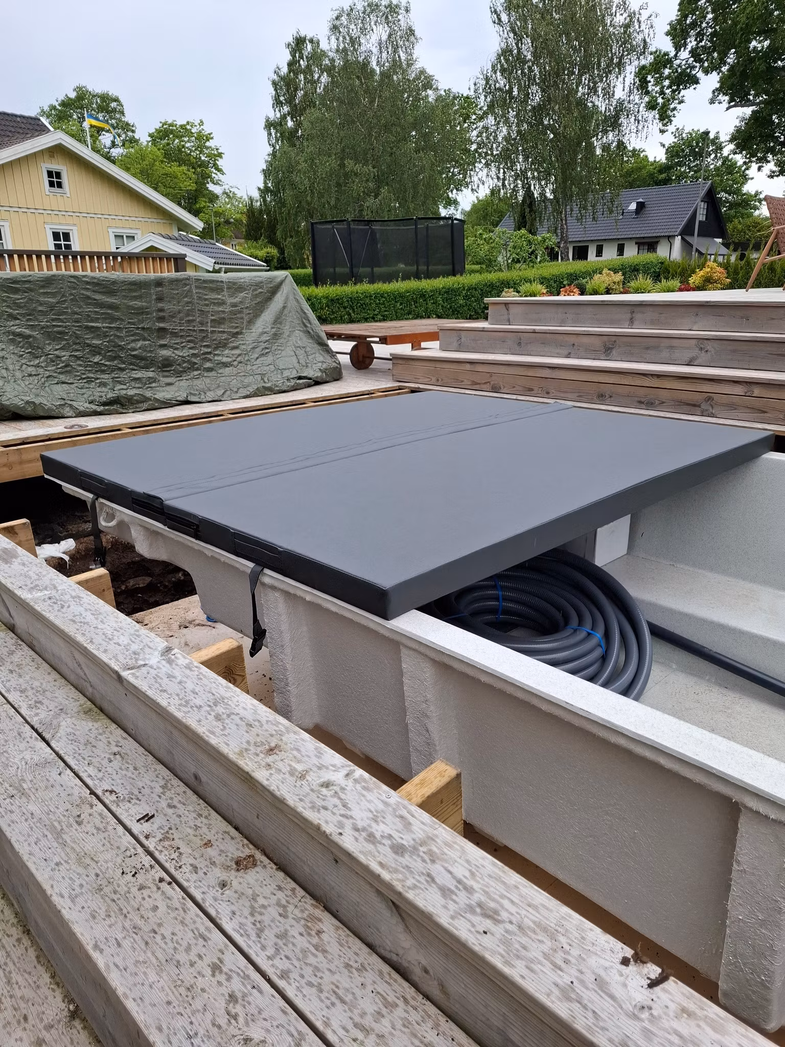 Vi har med våra fantastiska kunder tagit fram ett special måttbeställt lock som passar till denna pool modell då man vill kunna bada året runt. Snygg antra