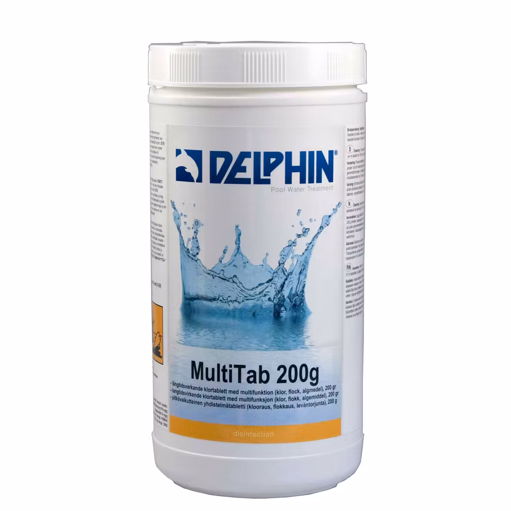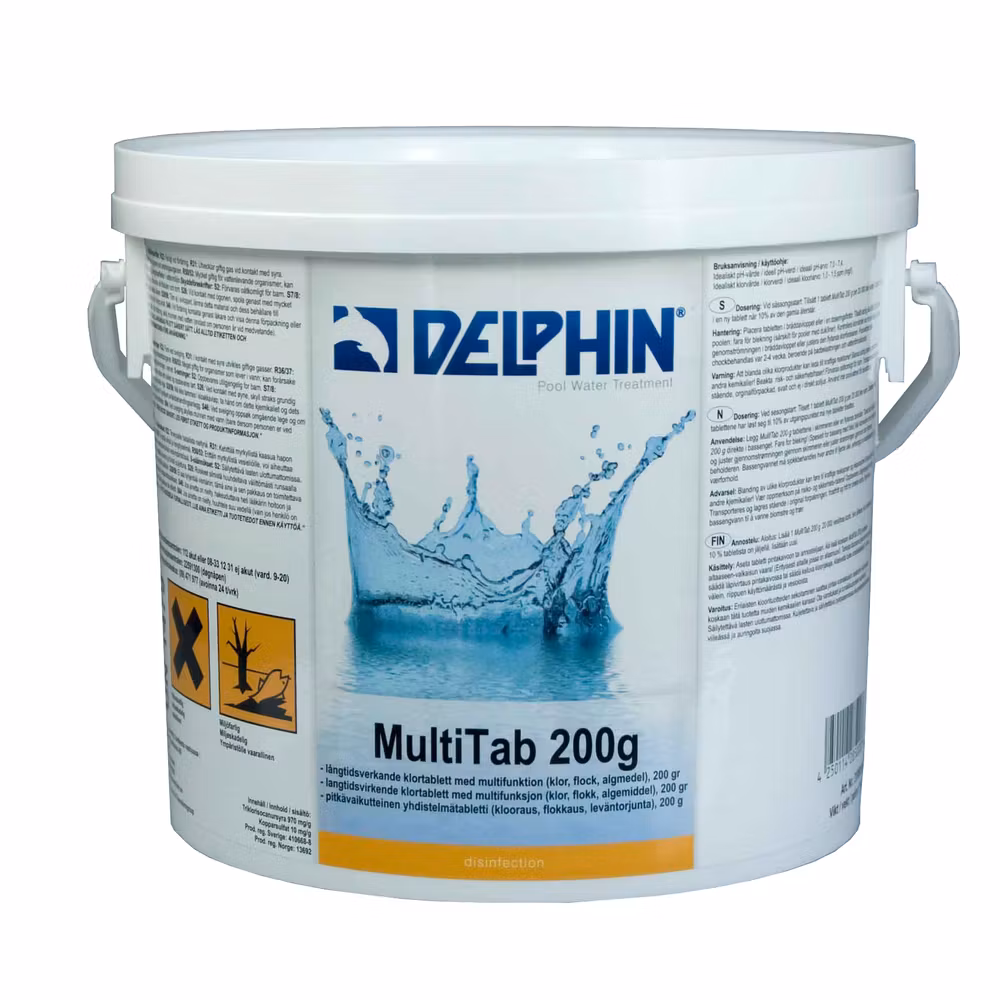 MultiTab 200g klortablett är en långsamtlösande tablett med 87% aktivt klor, algmedel och flockningsmedel. pH-neutralt och utan kalk.