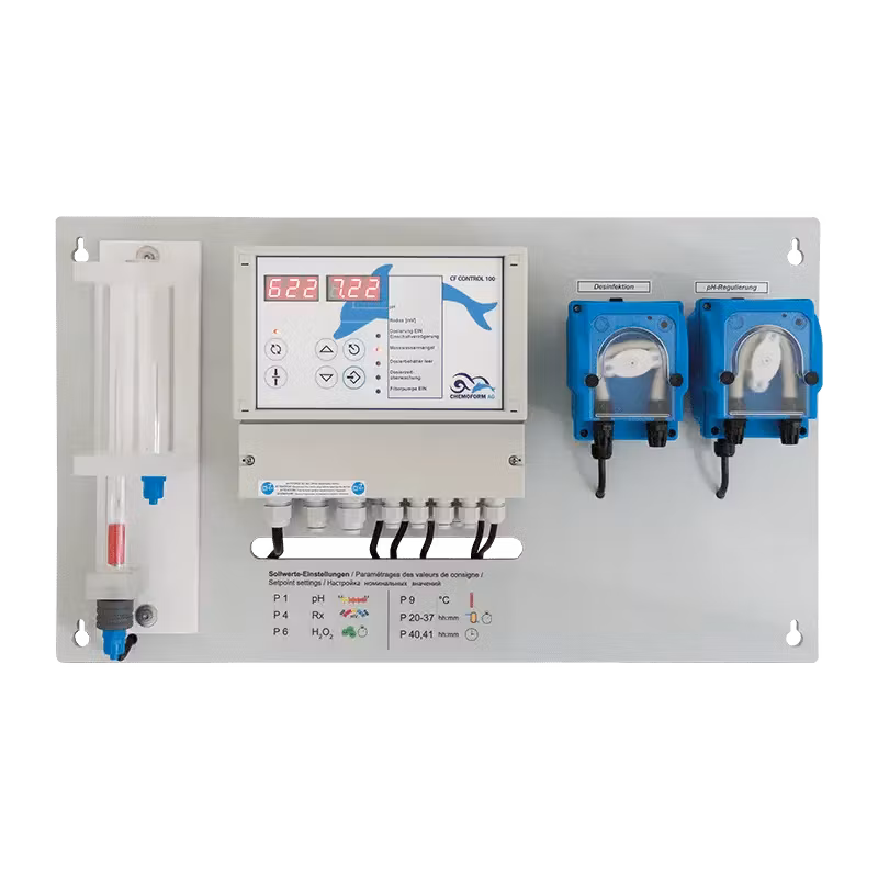 Den slitagefria redoxelektroden kräver ingen kalibrering (den är underhållsfri). Beroende på modell används CF Control 100 för desinfektion med klor eller aktivt syre. Dosering via respektive extern pump.