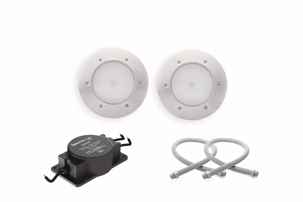 Poolbelysnings-paket Marine i rostfritt syrafast stålKomplett paket inklusive 2 st LED lampa 18W vit i rostfritt stål, 2 st Kabelrör, och Transformatorobs, du b