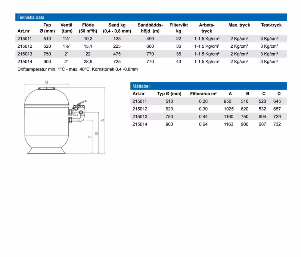 Filterstorlekar Ø 510, 620, 750 och 900 mm. Komplett med manometer och sidoventil 1½ för Ø 510 och 620 mm filter och 2 för Ø 750 och 900 mm filter. Beskrivning Manualer Filterstorlekar Ø 510, 620, 750 och 900 mm. Komplett med manometer och sidoventil 1½ för Ø 510 och 620 mm filter och 2 för Ø 750 och 900 mm filter. Typ 750, Lämplig pump 0,75 kW, lämplig vattenvolym 100 m3, filterarea 0,44 m2 Egenskaper Topplucka för enkel öppning Fällbar diffusor underlättar vid fyllning av filter media Bottenventilens placering och utformning underlättar tömning av vatten och sand Intern avluftning förhindrar uppkomst av luftbubblor i filtret Produktblad