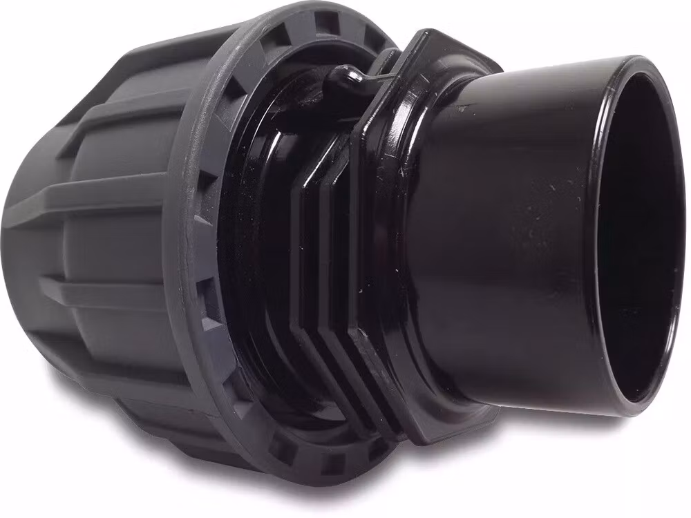 Produktbeskrivning Slangkoppling - övergångsmuff med spänn x limsockel 50mm tillverkad i PVC-U.