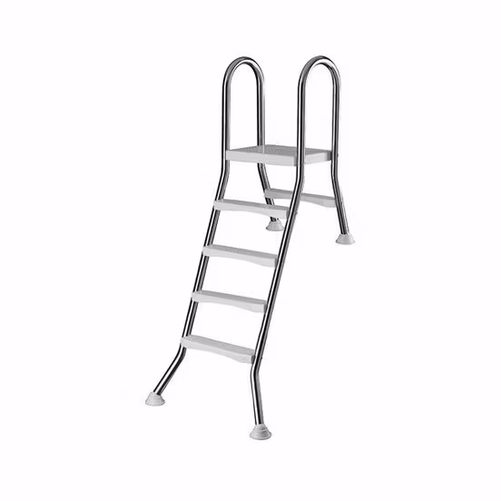 Produktbeskrivning Rostfri stege med 4 steg i poolen och 1 steg utanför, lämplig till 120 cm djupa pooler som är delvis nedgrävda i marken eller inbyggda i ett