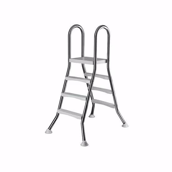 För ovanmarkspooler med 100 cm djup. Beskrivning För ovanmarkspooler med 100 cm djup. 3 steg på vardera sidan samt plattform överst för lätt i- och urstigning. Stegen har 3 steg utvändigt och 3 steg invändigt. I rostfritt stål (A2) och steg i plast med mönstring för bästa grepp och halkskydd. Maxvikt 150 kg