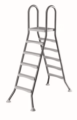 För ovanmarkspooler med 150 cm djup. 5 steg på vardera sidan samt plattform överst för lätt i- och urstigning. Beskrivning För ovanmarkspooler med 150 cm djup. 5 steg på vardera sidan samt plattform överst för lätt i- och urstigning. Stegen har 5 steg utvändigt och 5 steg invändigt. I rostfritt stål (A2) och steg i plast med mönstring för bästa grepp och halkskydd. Maxvikt 150 kg