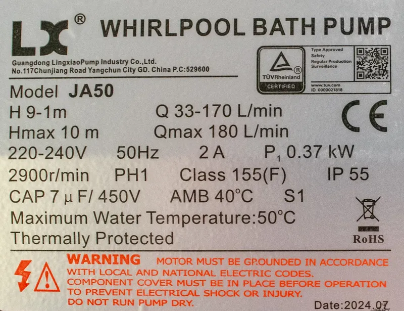 Whirlpool JA50 LX filtreringspump är en av världens mest använda cirkulationspumpar för spadpool. Den kan hittas, ibland under andra namn, i spa tillverkade på alla kontinenter. Den är till exempel en perfekt ersättning för Spanet XS-3C.