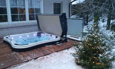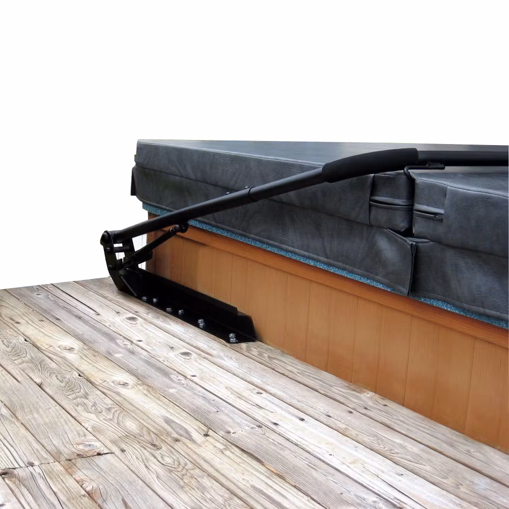 CoverMate III DeckMountI DeckMount fästs monteringsfästena direkt på däcket. Denna version är speciellt lämpad för helt nedsänkta spabad. Det exklusiva vindlåssystemet är det enda i sitt slag och förhindrar stängning vid kraftiga vindar. Tillverkad av svart pulverlackerad aluminium och utrustad med gummigrepp och krokar för han