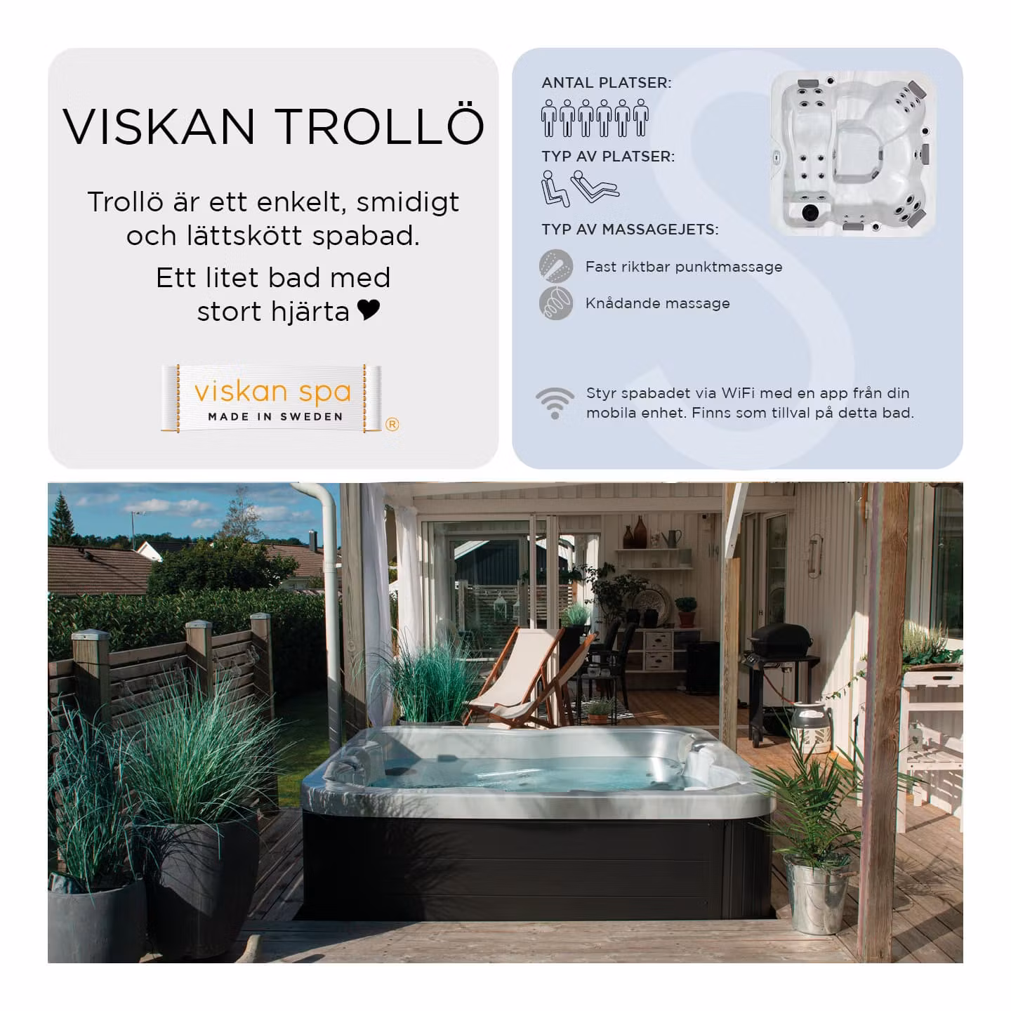 Trollö är enkelt, smidigt och lättskött – precis så som det skall vara. Trollö har en skön liggplats och plats för ytterligare fyra personer och egentligen det mesta du kan önska i ett spabad. Badet må vara litet i yttermått, men har designats för att många ska kunna njuta av ett bad tillsammans. Detta märker du när du provar Trollö. För sin storlek, så ger den gott om plats för hela familjen.