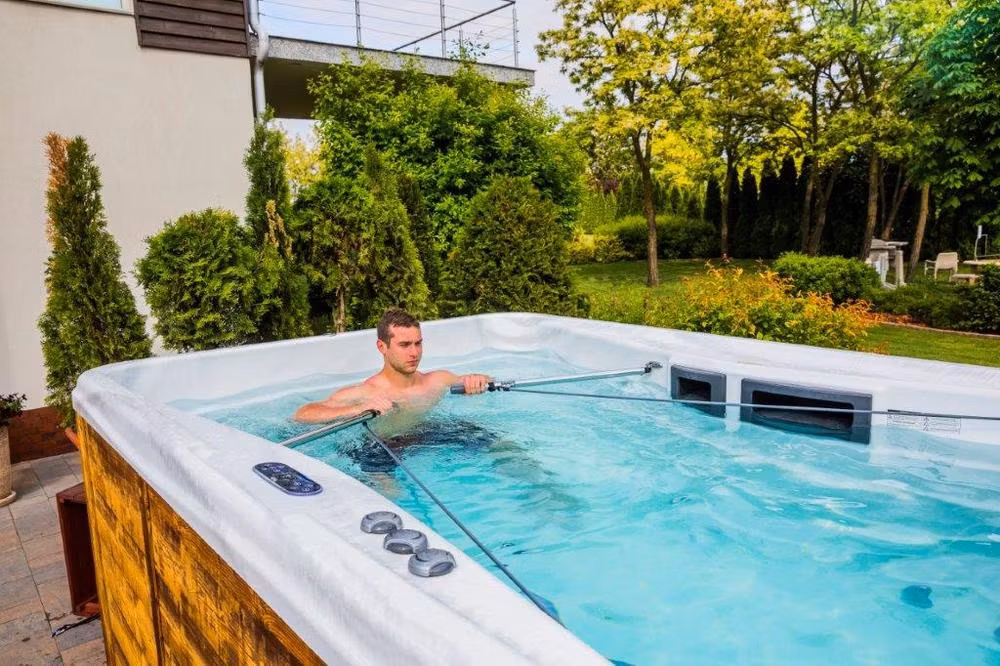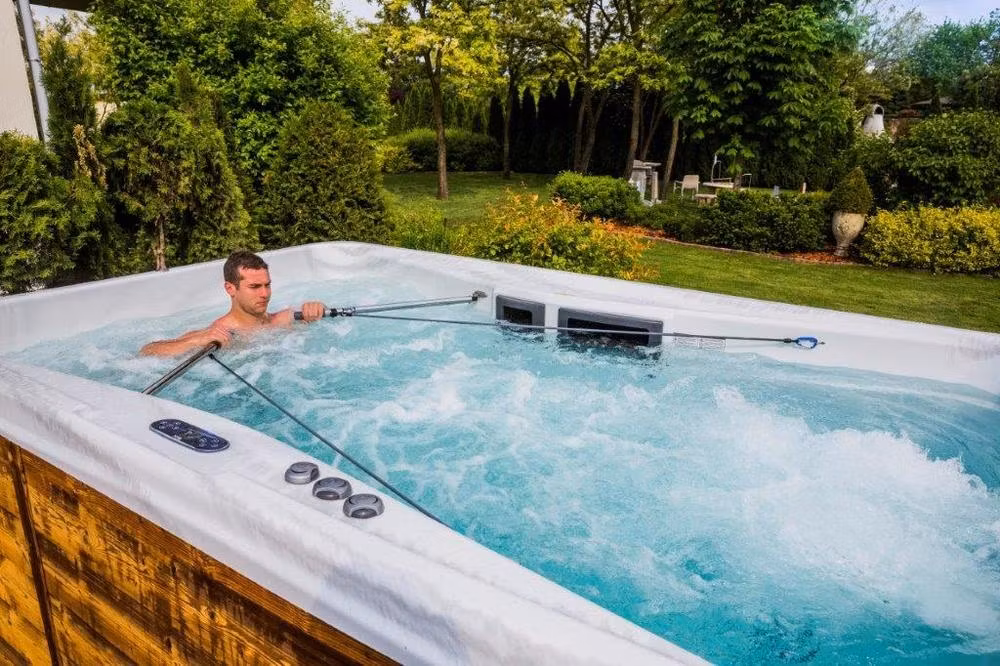 Med Wellis Swimspa Roddsystem kan enkelt och bekvämt träna i din egen backgård.
